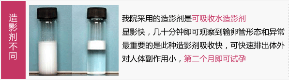 很多医院采用的是碘油造影,碘油显影慢,检查时间长,要反复进行几次拍摄,而且刺激性大,术后腹痛重,有时引起化学性腹膜炎,吸收慢,易引起异物反应,形成肉芽肿,如多量进入静脉,有引起油栓的危险。有副作用,需避孕3-6个月才可试孕。